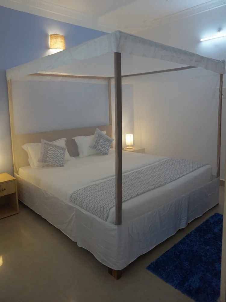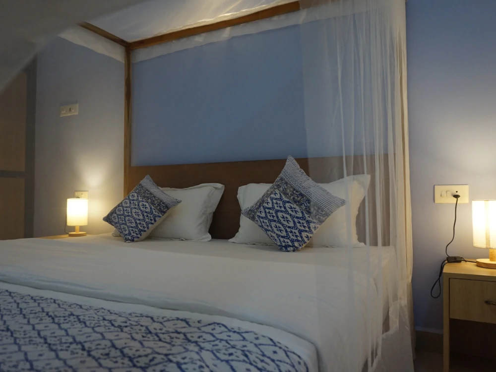 There are towels, a fan, bed side tables, wardrobe/closet/cupboard and a mosquito net to protect you from any mozzy bites or other sleep disturbing nasties.